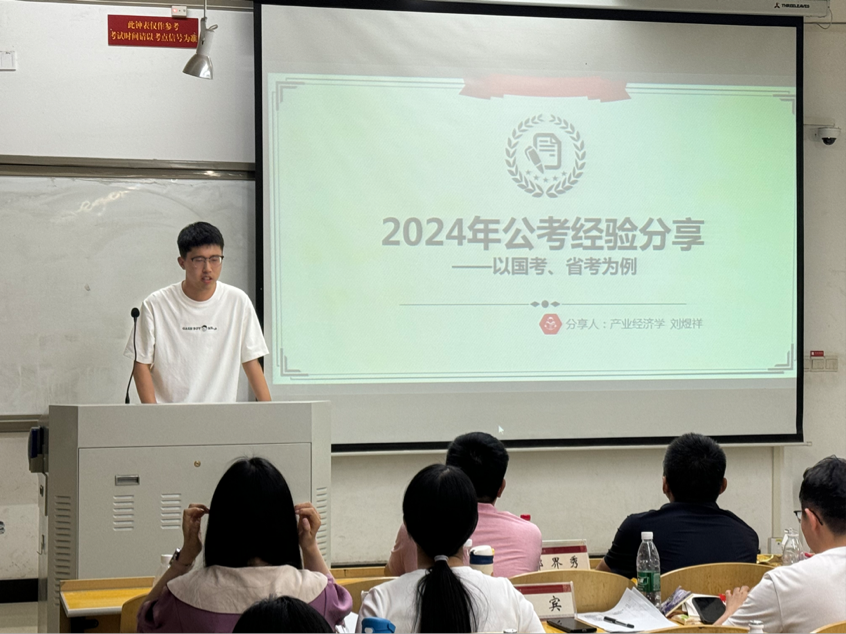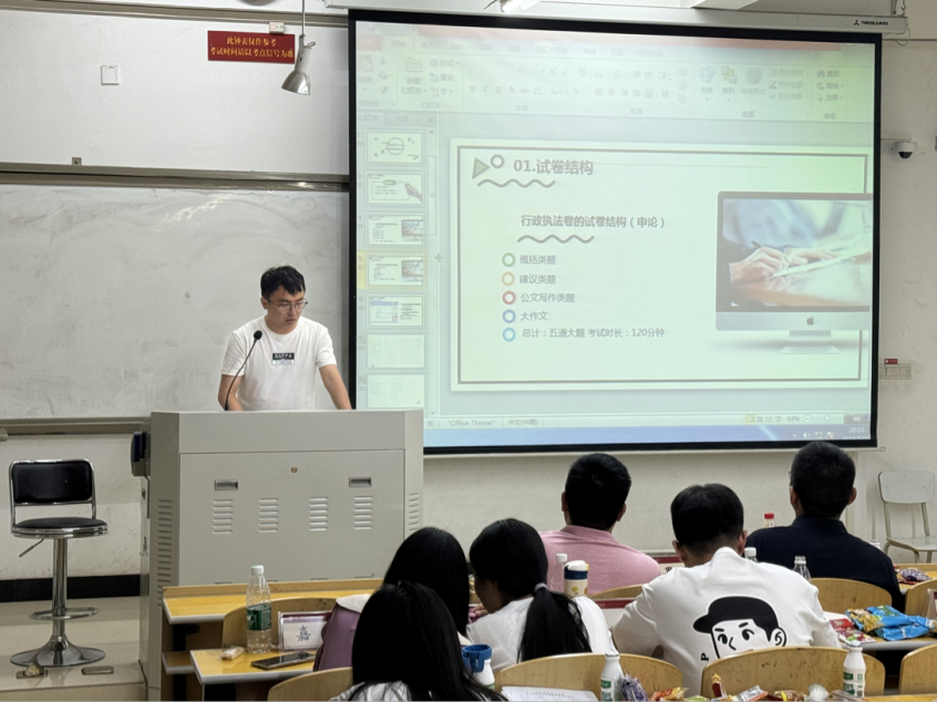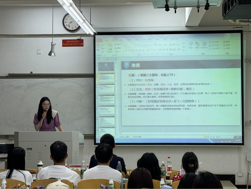 在分享环节,六位优秀毕业生结合自己的亲身经历,从论文写作、选调生备考、申博准备及公务员备考这几个方面向同学们进行了经验分享。王蒙同学强调了论文写作过程中应当注意的事项及可能遇到的问题,给同学们介绍了如何写出一篇高质量毕业论文;甄莹同学则分享了自身对于选调生考试的经验,讲解了选调生考试和公务员考试的区别以及如何进行岗位选择;司宇同学结合自身申博经历,在院校选择、导师联系等多个方面给同学们分享了心得;赵娟同学、刘煜祥同学及王子奇同学作为本次公务员考试中获得心仪岗位的优秀毕业生,先后讲解了在国考省考中的资料选择、时间安排、心态管理,分析了考试的试卷结构等要点,为有意向参加公务员考试的同学分享了自己的备考经验。六位优秀研究生毕业生代表在各自经验分享结束后,为与会同学进行了逐一答疑解惑,有针对性地进行了进一步的深入交流。现场气氛热烈,掌声不断。
