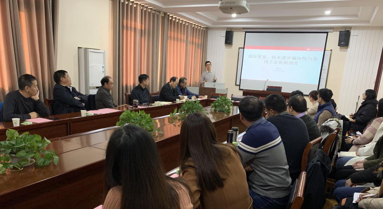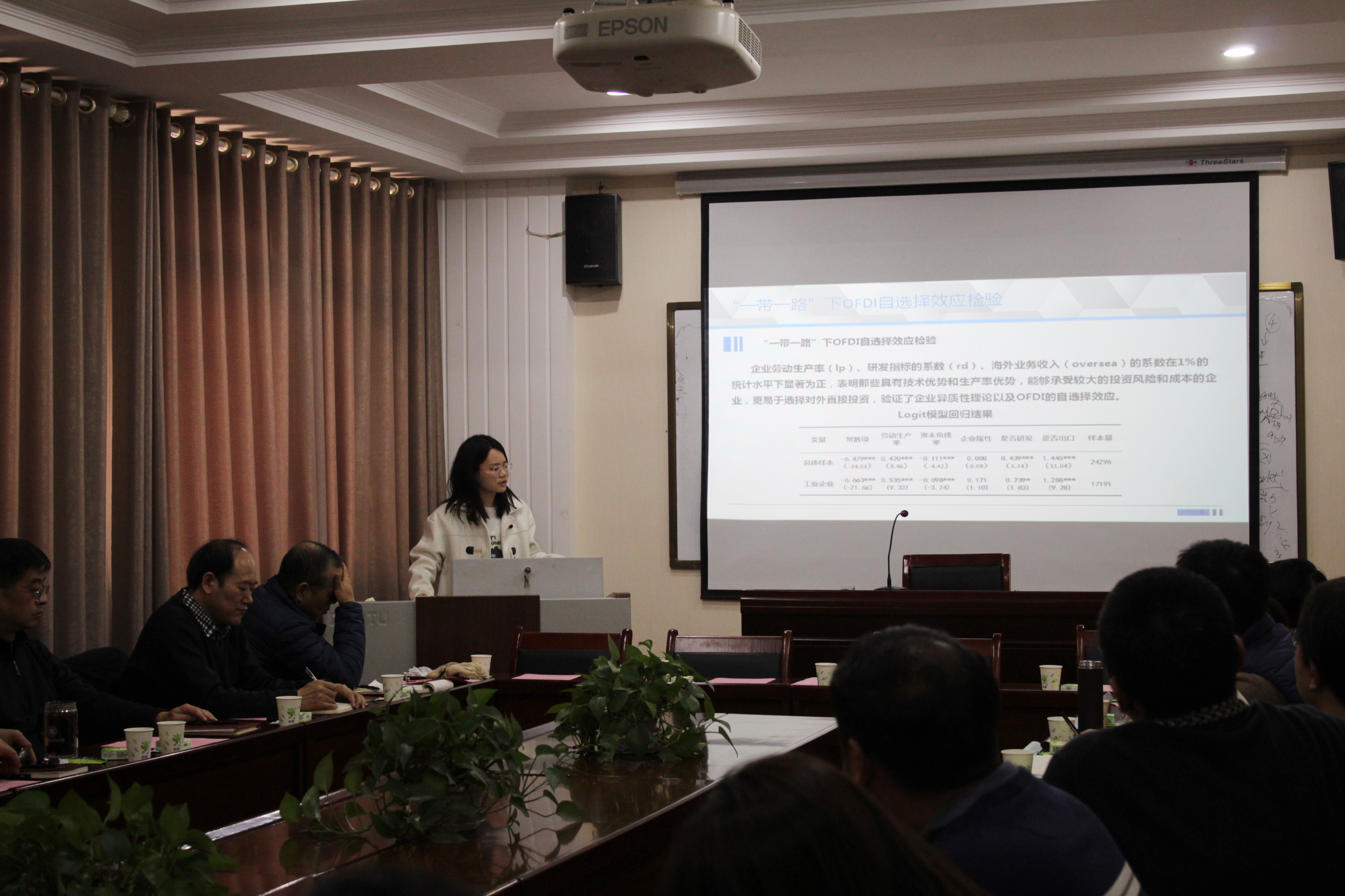 会上,高新才校长就人才培养、内涵发展、经济学科建设等作了阐释,对近年来我院学生培养工作做出了极大肯定,表达了对学院学科建设、学术工作的重视,提出了对我院教育改革、科研能力等方面进一步提高的期待。会前,院长张占东教授致辞,就应用经济学人才队伍建设、学术带头人及学术骨干、科研成果、人才培养等方向进行了逐一汇报,从人才资源引进、教师队伍考核、博士科研要求等方面突出了我院“对未来负责、对国贸负责、对学校负责”的科研队伍建设思想。随后,博士创新团队负责人郭界秀博士对我院博士创新团队成立一年来的主要工作及经验进行报告,就团队运行宗旨、原则和内容逐一总结,提出通过机制化、常态化学术交流提升我院整体科研水平,培养高水平科研人才的目标。随后,青年博士代表李凯杰副教授就“国际贸易、技术进步偏向性与我国工业能源强度”进行课题汇告,通过介绍研究动机、理论机制、计量模型、指标测度,详细讲解了如何采用不同的回归方法、引用窗口、稳定性检验验证不同的贸易开放度、部门以及竞争程度的行业下国际贸易对能源强度效应影响所存在的差异性。18级研究生高媛基于自选择效应与再配置效应就“一带一路倡议下对外直接投资与企业转型升级研究”进行学术分享,以“一带一路”倡议提出为准自然实验切入点,利用双重差分的方法系统评估了“一带一路”倡议下对外直接投资与企业转型升级的关系及其作用机制。最后,国务院政府特殊津贴专家、校特聘教授李新安老师作了题为“学术研究与国家项目申报”专题报告,详细解读了国家社科基金青年项目、一般项目、国家自然科学基金等项目申报要领,并从原始文献阅读、前期成果发表、团队成员选择、申报书撰写等四个关键点作了详细阐述。会议期间,博士创新团队成员的积极发言,大家进行热烈的探讨交流并提出各自的建议和想法,会议氛围达到高潮。