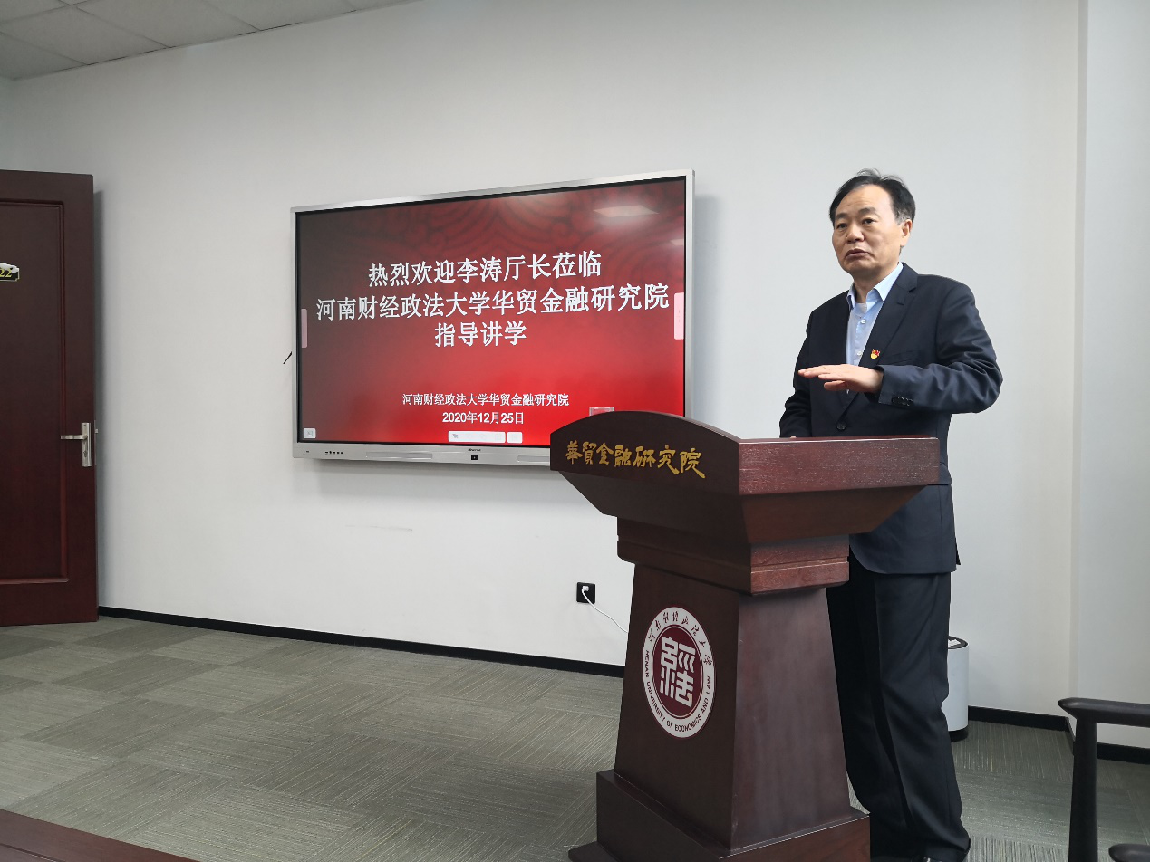 12月25日下午,河南省工业与信息化厅党组书记、厅长李涛应我校邀请,在图书馆华贸金融学院报告厅为我校师生做了专题报告。此次报告会由华贸金融研究院承办,我校部分教师、国贸学院和工商管理学院研究生等参加了报告会。