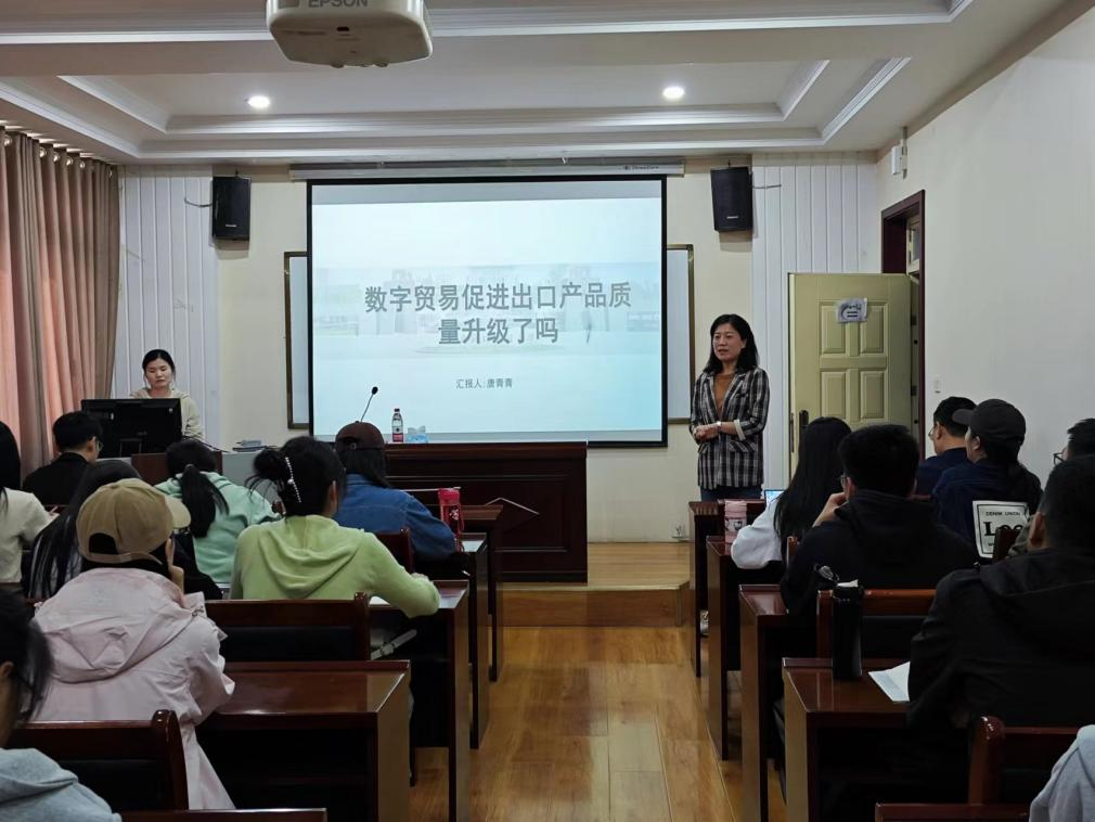 此次学术交流会由青年博士唐青青主讲,汇报主题是《数字贸易促进出口产品质量升级了吗》。汇报中,从确定选题、引言、文献综述、理论机制、指标测度、实证分析和政策建议等方面对主题核心内容进行讲解,同时探讨了论文写作和投稿过程中可能涉及的问题以及解决方式。在交流发言阶段,各位老师和同学围绕文章中涉及的数据选取、内生性问题处理和数理模型推导等问题进行深入讨论。